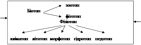 Геосистеми, різні за розмірами розрізняють залежно від: - факторів, що визначають їх внутрішню структуру, - основних підхордів та методів дослідження, - цілей наукових та практичних знань. Виділяють 6 рівнів територіальної розмірності геосистем: 1. Глобальний (планетарний) – географічна оболонка (досліджується загальним землезнавством). 2. Субглобальний – визначається двома факторами: кулеподібністю форми Землі та плитовою тектонікою. Ці фактори зумовили формування таких геосистем, як географічні пояси, континенти, субконтиненти. Субконтиненти – це найменші територіальні одиниці, близькі до такої одиниці як фізико-географічні країни. Їх внутрішня територріальна структура визначається такими факторами як розташування щодо океанів та гірських систем,, загальної циркуляції атмосфери тощо. 3. Регіональний – зони, підзони, області, провінції. Геосистемою, за критеріями виділення та змістом близькою до фізико-географічної області є макрогеохора. Вона розглядається як найменша одиниця регіонального рівня та найбільша місцевого (хоричного). Особливістю є те, що регіональні геосистеми сформувалися під беспосереднім впливом зовнішніх планетарно-астрономічних факторів. 4. Хоричний – (В основі відособлення геосистем хоричного рівня лежить суто внутрішні ландшафтно-екологічні фактори, які у сфері взаємодії геокомпонентів трансформують зовнішні сигнали: тектонічні рухи, надходження тепла, вологи тощо. До таких факторів належать екзогенні процеси, що створюють різноманітні форми та елементи рельєфу, відповідно змінюється величина сонячної радіації, перерозподідляється волога, мінеральні речовини тощо.) на цьому рівні чітко виділяють такі структури як ландшафт, місцевіть, урочище, фація (геотоп). 5. Топічний – геотоп (фація), ландшафтно-екологічні дослідження на цьому рівні зводяться до виділення геотопів та аналізу їх вертикальних структур. 6. Субтопічний – частини фацій, що характеризуються специфічними розмірами, діяльністю існування, факторами виникнення та ін. Елементарна ландшафтно-екологічна територіальна одиниця – геотоп (за старою назвою – фація). Якщо в межах деякої ділянки жоден з геокомпонентів не вдається розділити на два рзних кваліфікаційних підроділи то така ділянка може вважатися за однорідну (елементарну). Ніякої природної межі (грунтової, геоботанічної тощо) через геотоп провести не можна. Однак, штучно можна виділити геокомпоненти і за їх типами розділяють геотопи. За факторами топічної диференціації ландшафту виділяють: - морфотопи (однорідні елементарні поверхні рельєфу), - літотопи (ділянки, однорідні за геологічною будовою), - гідротопи (за умовами зволоження), - кліматопи (за мікрокліматом), - педотопи (за грунтом), - фітотопи (за рослинністю), - зоотопи (за тваринним населенням). Їх проторовий збіг та взаємодія утворюють комплексну територіальну одиницю – геотоп. Структура геотопу представлена на рисунку: