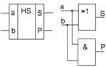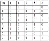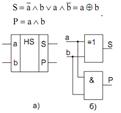 Напівсуматор (рис. 3) має два входи a і b для двох чисел, що сумуються і два виходи: S – сума, P – переніс. Позначають напівсуматор буквами HS (half sum – напівсума). Роботу його відображає таблиця істинності (табл. 2),