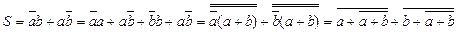 w послідовні, у яких обробка чисел ведеться по черзі, розряд за розрядом на тій самій елементній базі; w паралельні, у яких доданки додаються одночасно по всіх розрядах, і для кожного розряду є своя елементна база. На рисунку 1 приведена схема n-розрядного паралельного суматора. X=x1x2…xn, Y=y1y2…yn - X i Y – n-розрядні додатні, S=s1s2…sn - результат додавання. Чвертьсуматор, синтез схеми Найпростішим двійковим сумуючим елементом є чвертьсуматор. Походження назви цього елемента випливає з того, що він має в два рази менше виходів і в два рази менше рядків у таблиці істинності в порівнянні з повним двійковим однорозрядним суматором. Найбільш вживані назви: елемент “сума по модулю 2” і елемент “виключаюче АБО”. Схема (рис. 2) має два входи а і b для двох доданків, що додаються, й один вихід S для суми. Роботу її відображає таблиця істинності (табл. 1), а відповідне рівняння має вигляд: S=a̅b+ab̅=a⊕b