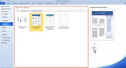 Рис. 2.16. Создание документа на основе установленного шаблона 4. При наличии подключения к Интернету можно обратиться к шаблонам, расположенным на сайте Microsoft Office. В разделе Шаблоны Office.com (см. рис. 2.17) щелкните по значку нужной группы шаблонов, дождитесь, пока они загрузятся. Прокручивая список (рис. 2.16), выберите нужный шаблон и дважды щелкните по его значку или выделите этот значок и нажмите кнопку Загрузить.
