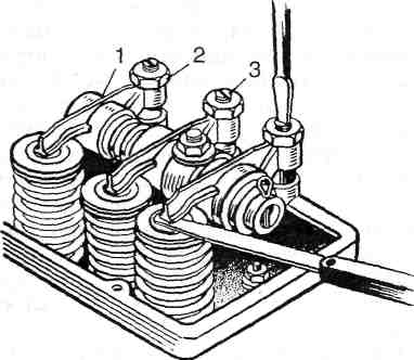 Рис. 1. Перевірка й регулювання теплового зазору: 1 — коромисло; 2 — контргайка; 3 — регулювальний гвинт.