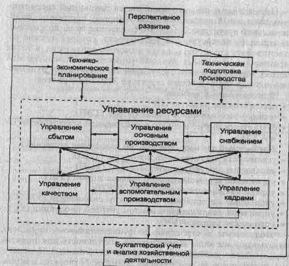 Рис. 1.3. Структура функциональных подсистем ЭИС, выделенных по функционально-предметному принципу Целью создания подсистемы «Перспективное развитие» являются прогнозирование и стратегическое планирование финансово-хозяйственной деятельности предприятия на ближайшую и отдаленную перспективу. В подсистеме проводятся следующие исследования: рынка сбыта продукции, развития технологий производства и сырьевого рынка, собственных резервов, направлений реконструкции и модернизации предприятия, территориального распределения и нового строительства экономических объектов и др. Проведение перспективных исследований предполагает решение задач долгосрочного прогноза (10-20лет) и разработки перспективного плана (на 5 лет) на основе аналитических данных, подготавливаемых в подсистеме «Бухгалтерский учет и анализ хозяйственной деятельности», за ряд лет. Результаты решения задач подсистемы «Перспективное развитие» используются прежде всего при решении задач технико-экономического планирования и технической подготовки производства В подсистеме «Техническая подготовка производства» автоматизируются функции управления процессом проектирования изготовления и внедрения новых конструкций изделий, оснастки, инструмента или модернизации действующего производства, а также выполнение научно-исследовательских и опытно-конструкторских работ. Основной целью создания подсистемы ТПП являются сокращение сроков подготовки и выпуска новой продукции, модернизация освоенной продукции, минимизация материальных, трудовых и финансовых затрат на их выпуск. К задачам, решаемым в подсистеме, относятся; конструирование новых видов изделий и получение их чертежей, разработка технологической документации поизготовлению и организация их производства. В подсистеме ТПП используются прогнозные и плановые данные подсистемы перспективное развитие и текущие аналитические данные подсистемы бухгалтерский учет. Результаты решения задач подсистемы используются в подсистемах технико-экономического планирования, управления ресурсами, бухгалтерского учета и анализа хозяйственной деятельности. Целью подсистемы «Технико-экономическое планирование» является формирование годовых производственных программ на основе использования экономико-математических методов, позволяющих увязывать прогнозируемый объем сбыта продукции с имеющимися производственными мощностями, материальными, трудовыми и финансовыми ресурсами, а также распределение годовой производственной программы по плановым периодам, В результате технико-экономического планирования составляется комплекс планов сбыта, основного и вспомогательного производства, материально-технического снабжения, управления качеством, использования финансовых средств, набора кадров и т.д. Технико-экономическое планирование осуществляется на основе данных, получаемых в подсистемах перспективного развития, технической подготовки производства и бухгалтерского учета. Результаты технико-экономического планирования непосредственно используются в подсистемах управления ресурсами. Подсистема «Управление реализацией и сбытом готовой продукции» предназначена для оперативного управления сбытом продукции в соответствии с технико-экономическим планом, определенными договорами и зак