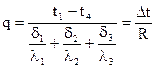 Отношение Рассмотрим теплопроводность плоской многослойной стенки, состоящей из 3 материальных слоев, плотно прилегающих один к другому. Каждый слой имеет заданную толщину δi и коэффициент теплопроводности λi. Многослойными являются, например, стены и перекрытия крупнопанельных и кирпичных зданий. Плотность теплового потока определяется из равенства: