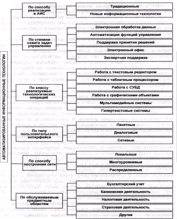 Рисунок 2.2. – Классификация автоматизированных информационных технологий По способу реализацииАИТ в АИС выделяют традиционно сложившиеся и новые информационные технологии. Если традиционные АИТ прежде всего существовали в условиях централизованной обработки данных, до массового использования ПЭВМ были ориентированы главным образом на снижение трудоемкости при формировании регулярной отчетности, то новые информационные технологии связаны с информационным обеспечением процесса управления в режиме реального времени. По степени охвата АИТ задач управления выделяют: - электронную обработку данных, когда с использованием ЭВМ без пересмотра методологии и организации процессов управления ведется обработка данных с решением отдельных экономических задач; - автоматизацию управленческой деятельности. Во втором случае вычислительные средства, включая суперЭВМ и ПЭВМ, используются для комплексного решения функциональных задач, формирования регулярной отчетности и работы в информационно-справочном режиме для подготовки управленческих решений.?К этой же группе могут быть отнесены АИТ поддержки принятия решений, которые предусматривают широкое использование экономико-математических методов, моделей и ППП для аналитической работы и формирования прогнозов, составления бизнес-планов, обоснованных оценок и выводов по изучаемым процессам, явлениям производственно-хозяйственной практики.?К названной группе относятся и широко внедряемые в настоящее время АИТ, получившие название электронного офиса и экспертной поддержки решений. Эти два варианта АИТ ориентированы на использование последних достижений в области интеграции новейших подходов к автоматизации работы специалистов и руководителей, создание для них наиболее благоприятных условий выполнения профессиональных функций, качественного и своевременного информационного обслуживания за счет полного автоматизированного набора управленческих процедур, реализуемых в условиях конкретного рабочего места и офиса в целом. Электронный офис предусматривает наличие интегрированных пакетов прикладных программ, включающих специализированные программы и информационные технологии, которые обеспечивают комплексную реализацию задач предметной области. В настоящее время все большее распространение приобретают электронные офисы, оборудование и сотрудники которых могут находиться в разных помещениях. Необходимость работы с документами, материалами, базами данных конкретной организации или учреждения в домашних условиях, в гостинице, транспортных средствах привела к появлению АИТ виртуальных офисов. Такие АИТ основываются на работе локальной сети, соединенной с территориальной или глобальной сетью. Благодаря этому абонентские системы сотрудников учреждения независимо от того, где они находятся, оказываются включенными в общую для них сеть. Автоматизированные информационные технологии экспертной поддержки составляют основу автоматизация труда специалистов-аналитиков. Эти работники кроме аналитических методов и моделей для исследования складывающихся в рыночных условиях ситуаций по сбыту продукции, услуг, финансового положения предприятия, фирмы, финансово-кредитной организации вынуждены использовать накопленный и сохраняемый в системе опыт оцен