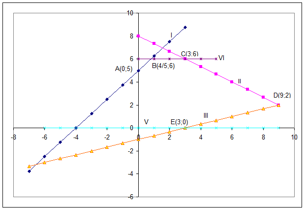 Координаты угловых точек – вершин многоугольника находятся как координаты точек пересечения соответствующих прямых. Например, точка D – пересечение прямых II и III, т.е. ее координаты являются решением системы
