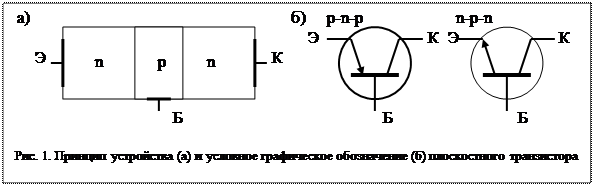 Биполярные транзисторы. В числе электропреобразовательных полупроводниковых приборов важное место занимают транзисторы. Транзисторы представляют собой полупроводниковые приборы, пригодные для усиления мощности и имеющие три выхода или больше. В транзисторах может быть разное число p-n переходов, однако наиболее распространенными являются транзисторы с двумя p-n переходами. Такие транзисторы называются биполярными, поскольку их работа основана на использовании носителей заряда обоих знаков. Первые биполярные транзисторы были точечными, работали неустойчиво. В настоящее время изготовляются и применяются исключительно плоскостные биполярные транзисторы. Устройство биполярного плоскостного транзистора и его графическое обозначение показаны на рис.1.