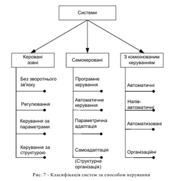 Ця класифікація здійснена на двох рівнях (рис. 7). Перший рівень класифікації визначає, чи входить блок керування у саму систему чи знаходиться поза нею. Самокеровані системи мають власний блок керування, у систем, керованих зовні, блок керування відсутній і існує тільки зовнішнє керування. Системи з комбінованим керуванням - це такі системи, в яких є блок керування у самій системі, за допомогою якого здійснюється керування певними параметрами, але система підлягає також зовнішньому керуванню.