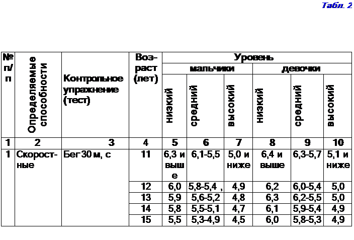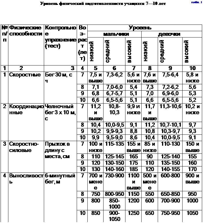 ОБЩЕПРИКЛАДНАЯ ФИЗИЧЕСКАЯ ПОДГОТОВКА Общеприкладная физическая подготовка направлена на общее физическое развитие школьников, укрепление их здоровья, совершенствование двигательных действий в разных условиях жизни. Средства общеприкладного направления физического воспитания: 1. Естественные, жизненно необходимые движения человека: ходьба, бег, прыжки, метание, лазанье, перелезание и их вариации. 2. Преодоление полосы препятствий (разной по трудности выполнения движений). 3. Туризм (как средство и метод физического воспитания) и прогулки на весельных лодках, велосипедах. 4. Обучение плаванию и спасанию утопающих. Прыжки в воду. 5. Разнообразные гимнастические и акробатические упражнения, единоборства. 6. Подвижные и спортивные игры, игры на местности. Коньки, лыжи, санки и др. Результаты общеприкадного направления физического воспитания школьников оцениваются нормативами физической подготовки на основе оценочных таблиц. Приводим примерные показатели уровня физической подготовленности учащихся 7— 10, 11-15, 16-17 лет (табл. 1-4) [1] . Школа должна научить учащихся умениям целесообразно в изменяющихся условиях (дождь, снег, лед, вода, песок) выполнить циклические, ациклические и смешанные движения. Научить школьников метать в цель и на дальность (в физкультурном зале, на местности), обучить плавать разными способами, прыгать в воду, оказывать первую помощь на воде и при случаях травматизма. Выполнять прикладные гимнастические упражнения (лазанье по канату, шесту, горизонтальному тросу), играть в разные подвижные и спортивные игры (на твердом грунте, песке, траве). Рекомендуется включать в занятия танцы, пляски, упражнения ритмической гимнастики, атлетической гимнастики, различные единоборства. По мнению П. Ф. Лесгафта, цель физических упражнений всегда должна состоять в умении владеть своими силами и применять их так, чтобы быстро и без траты лишних сил справляться с каждой физической работой, иначе говоря, чтобы уметь действовать просто и энергично [2] .