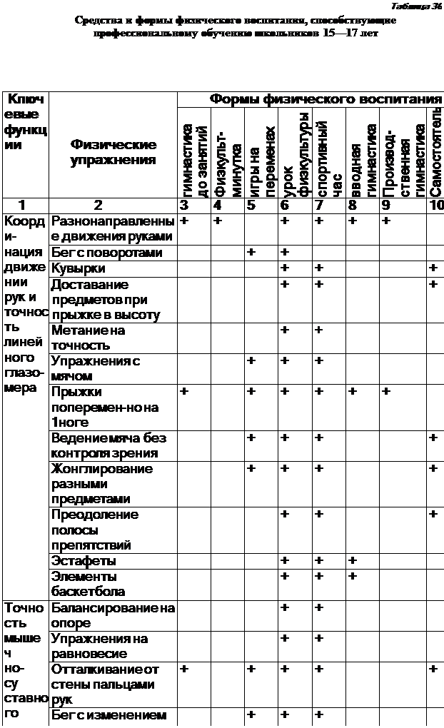 Профессионально-прикладная подготовка (ППФП) осуществляется в старших классах школы и направлена на развитие физических качеств, необходимых для конкретной профессиональной работы; изучение и совершенствование двигательных умений, сходных по структуре с трудовыми действиями; целенаправленное совершенствование физиологических функций организма с учетом специфики конкретной профессии; формирование волевых качеств, создающих устойчивое психическое состояние человека в процессе труда. При осуществлении ППФП учитываются температурный фактор окружающей среды (работа в поле, на фабрике, заводе, в мастерских); влажность и подвижность окружающего воздуха; шум в помещении; освещаемость, вибрационные нагрузки; монотонность или динамичность трудовых процессов; преимущественная нагрузка на верхний плечевой пояс, туловище, нижние конечности; амплитуда трудовых действий; фактор утомления; характер восприятия, зрения, слуха. Программу ППФП разрабатывает учитель и реализует ее на уроках физической культуры в режиме дня школьников, на внеклассных занятиях физическими упражнениями, в процессе проведения общешкольных физкультурно-массовых и спортивных мероприятий. На уроках физической культуры в содержание учебного процесса включают профессионально-прикладные физические упражнения. Необходимо, чтобы эти упражнения вписывались в урок физической культуры. Могут иметь место и специальные уроки, построенные на материале профессионально-прикладных физических упражнений. В проведение урока включают выполнение учениками специальных, прикладных нормативов. Упражнения ППФП включают в систему домашних заданий. Они вносятся в комплекс утренней гимнастики, физкультурной паузы, в содержание часа здоровья, подвижной перемены. Самостоятельные тренировки школьников, направленные на развитие физических качеств, должны содержать прикладные физические упражнения, с учетом характера овладеваемой профессии. При этом следует не забывать включать в самостоятельные тренировки выполнение требований гигиенического характера, проводить закаливающие мероприятия, овладевать умением правильно дышать при выполнении различных двигательных действий. Внеклассные формы занятий физической культурой и спортом осуществляются с учетом требований ППФП. Так, отдельные тренировочные занятия в спортивных секциях проводятся сопряженно с приобретаемой учеником профессией. Спортивные секции могут быть организованы по видам спорта, способствующим развитию профессионально значимых двигательных действий и физических качеств. Общешкольная физкультурно-массовая и спортивная работа включает проведение Дней здоровья и спорта с элементами ППФП. Соревнования школьников предусматривают выполнение нормативов профессионально-прикладной физической подготовки. Рекомендуется проведение отдельных соревнований по программе ППФП. Спортивно-физкультурные праздники также могут включать упражнения ППФП и служить пропагандой приобретаемых в школе профессий. Приводим средства и формы физического воспитания, способствующие профессиональному обучению (табл. 6).