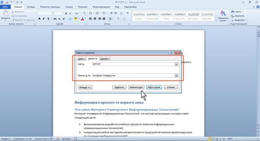 Рис. 5.17. Установка параметров поиска текста в документе Можно установить флажок Учитывать регистр, и тогда Word при поиске будет различать прописные и строчные буквы. Установка флажка Только слово целиком, обеспечивает поиск именно указанного слова, а не всех слов, в которые искомое слово входит как составная часть. Например, при поиске слова град установка указанных флажков позволит избежать нахождения таких слов как: о град а, на град а, Град осельский, град остроительство, град ирня и др. Похожее значение имеют флажки Учитывать префикс и Учитывать суффикс. В первом случае при поиске начала слова. Например, при поиске слова град установка флажка позволит избежать нахождения таких слов как: о град, на град и др. Во втором случае при поиске не учитывается не окончание слова. Например, при поиске слова град установка флажка позволит избежать нахождения таких слов как: град остроительство, град ирня и др. Флажок Не учитывать знаки препинания позволяет при поиске не учитывать наличие знаков препинания (точка, запятая, точка с запятой, двоеточие, восклицательный знак, вопросительный знак) в тексте документа. Флажок Не учитывать пробелы позволяет при поиске не учитывать количество пробелов в тексте документа. Флажок Подстановочные знаки позволяет использовать при поиске подстановочные знаки. При работе с английским языком установка флажка Произносится как позволяет искать похожие по звучанию слова. Например, если указать red, то найдутся red, reed, read, ride, ret, rate и т. п. Также при работе с английским языком установка флажка Все словоформы позволяет искать все формы английского слова, введенного в поле поиска. Следует иметь ввиду, что установленные параметры поиска действуют во всех открытых документах, запоминаются после завершения работы с Word и будут действовать при новом сеансе работы. Для очистки поля поиска в Области навигации нажмите кнопку с крестиком в правой части поля поиска. Выделение найденного текста в документе автоматически снимается при очистке поля поиска или закрытии Области навигации. В любом случае, данное выделение не выводится при печати документа. 1.5. Замена текста В документе может потребоваться заменить какой-либо текст. 1. Во вкладке Главная в группе Редактирование нажмите кнопку Заменить. 2. Во вкладке Заменить диалогового окна Найти и заменить в поле Найти введите искомый текст, в поле Заменить на - заменяющий текст (рис. 5.18).