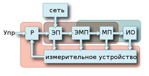 Функциональные элементы: 1) Регулятор (Р) предназначен для управления процессами, протекающими в электроприводе. 2) Электрический преобразователь (ЭП) предназначен для преобразования электрической энергии сети в регулируемое напряжение постоянного или переменного тока. 3) Электромеханический преобразователь (ЭМП) — двигатель, предназначен для преобразования электрической энергии в механическую. 4) Механический преобразователь (МП) может изменять скорость вращения двигателя, а также характер движения (с поступательного на вращательное или с вращательного на поступательное). 5) Упр — управляющее воздействие. 6) ИО — исполнительный орган.