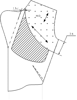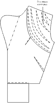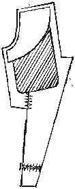 Волосяную накладку (рисунок 3, Б) изготавливают их хлопчатобумажных тканей с конским волосом или капроновой нитью в утке. Волосяная прокладка состоит из волосяного столбика и волосяной накладки. В волосяном столбике нить основы проходит вдоль детали, его ширина 7-8 см, длина на 2 см меньше длины волосяной накладки. В волосяной накладке нить основы проходит поперек детали. Выкраивают ее таким образом, чтобы ее срезы не доходили до линии перегиба лацкана на 2.0-2.5 см, до срезов пройм – на – 3-4 см, до плечевого среза – на 8-10 см. По центру груди располагают волосяной столбик, накрывают его волосяной накладкой. По краям волосяной накладки настрачивают сводку – полоску из х/б ткани шириной 2-3 см, которая необходима для предохранения срезов волосяной накладки от осыпания и для закрепления формы выпуклости груди. Сначала настрачивают внешний срез сводки, а затем внутренний.