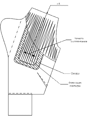 обработка бортовой прокладки и одновременное соединение ее с передом. В этом случае все детали бортовой прокладки укладываются клеевым покрытием вниз. По размеченным линиям детали стачивают для предотвращения их последующего смещения, одновременно стачивая все вытачки. На прессе соединяют бортовую прокладку с передом, одновременно формуя детали.
