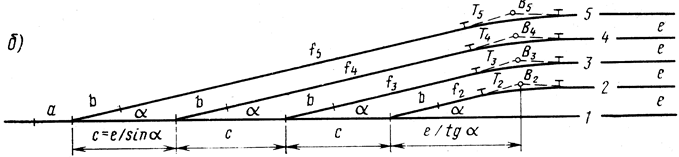де N - знаменник марки хрестовини. Центр першого переводу приймають за початок координат і, проектуючи на горизонтальну вісь X і вертикальну вісь Y відомі відстані з урахуванням кута нахилу, знаходять координати X і Y центрів переводів і вершин кутів повороту. Для розглянутих точок стрілочної вулиці У стрілочній вулиці, розташованій на основній колії (див. мал. 5.1, б), криві колій 2, 3 і ін. концентричні. Радіус R кривої колії 2 звичайно заданий. Радіуси кривих для наступних колій зростають на е, тобто R з = R 2 + е, R 4 = R 2 + 2 е тощо. Значення Т, К и f 2 знаходять по приведеним вище формулам, а координати центрів переводів і вершин кутів повороту легко визначаються при відомих значеннях е, С і а. Перевагою простих вулиць є гарна видимість і зручність обслуговування. Недолік їх – значне збільшення довжини горловини при великій кількості колій (пропорційно числу колій). Тому прості стрілочні вулиці застосовуються з переводами марки 1/9 переважно в невеликих парках (до чотирьох-п'яти колій). З двох видів простих стрілочних вулиць перевага надається першому (див. мал. 5.1, а), що має прямі колії в межах корисної довжини, що забезпечує кращу видимість при маневрах. Якщо основна колія 1 стрілочної вулиці є в той же час головною, треба застосовувати стрілочну вулицю під кутом хрестовини, щоб на головній колії укладати менше стрілочних переводів.
