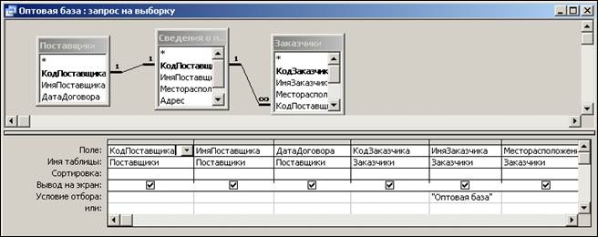 Теоретическое обоснование Данных в MS Аccess Лаб.раб. №7 Формирование запросов и отчётов для многотабличной базы 1 Цель и содержание: отработать приемы создания запросов в многотабличной базе данных. Отработать приемы и возможности вывода информации. Освоить возможности формирования и печати отчетов на основании таблиц и созданных запросов. 2.1 Формирование запросов для многотабличной базы данных. При использовании сразу нескольких таблиц в качестве исходных для запроса, программа Access возвращает результирующие данные, как один объединённый набор записей в Режиме таблицы. При создании многотабличного запроса в базе данных будут установлены все необходимые связи между таблицами. Многотабличный запрос может быть сформирован в Режиме конструктора и с помощью Мастера создания запросов. При создании многотабличного запроса в Режиме конструктора программа Access автоматически распознаёт установленные в базе данных межтабличные связи и отображает их в окне конструктора в виде линии объединения. Фактически в запросы можно включать и не связанные между собой таблицы – в этом случае объединение, функционирующее только в запросе, создаётся непосредственно в окне конструктора. С помощью Мастера создания запросов можно создать итоговый запрос. Итоговый запрос включает поле (поля), по которому группируются данные и числовые значения, с которыми будут производиться вычисления. 3.1 Задание 1. Создать запрос ОПТОВАЯ БАЗАна основании таблиц: ПОСТАВЩИКИ, СВЕДЕНИЯ О ПОСТАВЩИКАХ, ЗАКАЗЧИКИ. 3.1.1 Рекомендации по выполнению: 1. Откройте ранее созданную базу данных Поставки ФН. 2. В окне База данных: Поставки ФН откройте вкладку Запрос. 3. Создайте запрос в Режиме конструктора. 4. В появившемся окне Добавление таблицы выберите таблицы. 5. Включите в запрос все необходимые поля. Для этого: в строке Поле: выберите: первое поле – КодПоставщика (ПОСТАВЩИКИ); второе поле – ИмяПоставщика (ПОСТАВЩИКИ); третье поле – ДатаДоговора (ПОСТАВЩИКИ); четвертое поле – КодЗаказчика (ЗАКАЗЧИКИ); пятое поле – ИмяЗаказчика (ЗАКАЗЧИКИ); шестое поле – Месторасположение (ЗАКАЗЧИКИ). 6. В строку Условие отбора: поля ИмяЗаказчика поместите выражение «Оптовая база » (рис. 1).