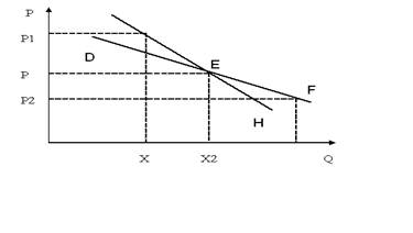 Если же фирма уменьшает цену, то конкуренты реагируют на такое сокращение с тем, чтобы предотвратить потерю своей доли рынка. Таким образом, завершающаяся кривая спроса состоит из двух сегментов —DE и ЕН с переломом в точке Е. Кривая спроса является ломанной линией DEH.
