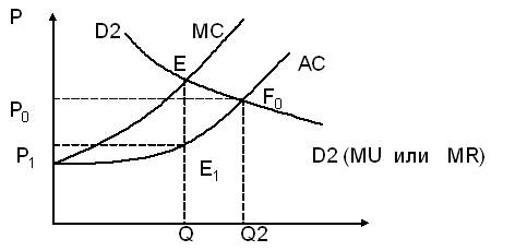 1) АС —кривая средних издержек в отрасли (сточки зрения монопсониста —это кривая предложения продукции). 2) МС —кривая предельных издержек отрасли (с точки зрения монопсониста —это кривая предельных издержек и приобретений). 3) D2D2 - кривая спроса (с точки зрения монопсонистов —кривая предельной полезности или предельного дохода (МU или MR). Точка равновесия покупателя (монопсониста) будет на пересечении кривых МС и МR. Это точка Е. Таким образом, на кривой АС находим точку Е1 - которая и определяет уровень цены приобретения монопсониста Р1. Она оказывается ниже цены Р0, которая была бы в условиях совершенной конкуренции покупателей. Важно отметить, что уровень объема закупок монопсонист определяет, сравнивая свои МС и МR находя точку их пересечения. 2. Ситуация когда понижается цена предложения. График N 9
