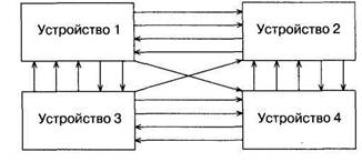 Рис. 2.2. Шинная структура связей. Большое достоинство шинной структуры связей состоит в том, что все устройства, подключенные к шине, должны принимать и передавать информацию по одним и тем же правилам (протоколам обмена информацией по шине). Соответственно, все узлы, отвечающие за обмен с шиной в этих устройствах, должны быть единообразны, унифицированы. Существенный недостаток шинной структуры связан с тем, что все устройства подключаются к каждой линии связи параллельно. Поэтому любая неисправность любого устройства может вывести из строя всю систему, если она портит линию связи. По этой же причине отладка системы с шинной структурой связей довольно сложна и обычно требует специального оборудования.