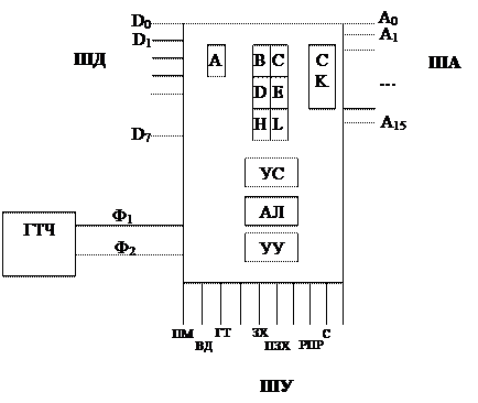 Каждое из устройств АЛУ и УУ обслуживается своими регистрами. А – аккумулятор, В, С, D – регистры данных, H и L старший и младший байт соответственно. СК – счетчик команд, УС – указатель стека. Генератор тактовой частоты ГТЧ посылает процессору периодичные импульсы для выполнения машинного цикла.