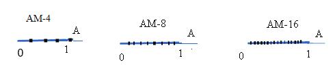 Ці відстані, не в останню чергу, залежать від кількості та порядку розташування сигнальних точок відповідного сузір’я на координатних площинах при двопараметричній, чи на числовій вісі при однопараметричній модуляції. Надалі для можливості порівнювати між собою мінімальні евклідові відстані в залежності лише від виду модуляції будемо вважати, що потужності сигналів, а отже і їх амплітуди (А) є нормованими, тобто однаковими (А = 1). Неважно визначити, що при однопараметричній багаторівневій амплітудній модуляції і нормованому значенні А = 1 мінімальна відстань дорівнює
