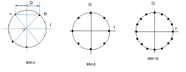 Наприклад, при М = 4 (рис. 1 а) у випадку ФМ сигнальні точки розташовані на векторах ОА та ОВ, які рознесені на кут π/2 і відповідають фазам, що можуть дискретно приймати значення 0°, 90°, 180° або 270°. Для визначення мінімальної відстані при ФМ слід розглянути трикутник АОВ. Неважко бачити, що цей трикутник має рівні сторони ОА та ОБ та центральний кут між ними, який дорівнює 2π/ М. Отже, при М = 4 ця величина дорівнює Використовуючи аналогічний підхід, можна визначити мінімальні відстані між точками для АФМ із m рівнями модуляції по амплітуді та із кількістю фаз, що дорівнює l, так що