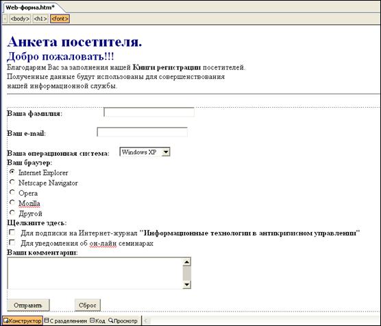 Перейдите внизу приложения в режим Просмотр – так ваша форма будет отображаться в окне Internet Explorer.