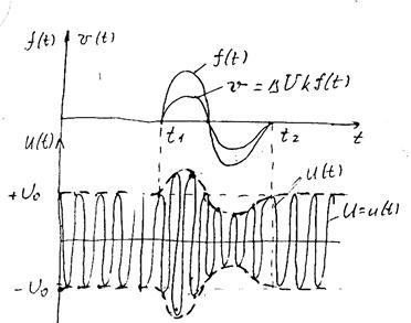 Отношение Используя ту или иную электрическую схему, напряжением U воздействуют на амплитуду колебаний носителя сообщений так, чтобы она увеличилась или уменьшилась в зависимости от модуля и знака напряжения U. В результате получается, что носитель будет изменяться уже по закону