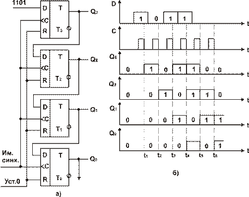 Рис. 5.2 Последовательный (сдвигающий) регистр: а) - функциональная схема; б) - временные диаграммы.