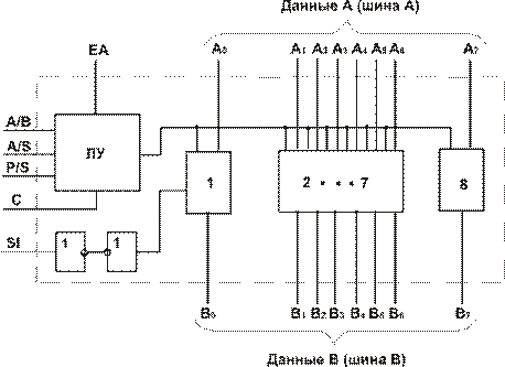 Рис. 5.5 Структурная схема регистра К561ИР6: ЛУ – логическое устройство; 1,2…8 – разряды регистра.