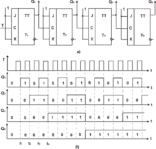Рис. 6.1 Суммирующий двоичный счётчик: а) - функциональная схема; б) - временные диаграммы.