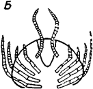 А – вид со спинной стороны: гщ – головной щит, т – глабель, пщ – подвижные, нщ – неподвижные щеки, гл – глаза, т – туловище, р – рахис, п – плевры, х – хвословой щит. Б – вид головного щита с брюшной стороны. В – продольное сечение трилобита: ро – ротовое отверстие, пт – пищеварительный тракт. Г – пандеровы органы(черное) у свернувшегося трилобита: щ – щека. Рисунок 22. Схема строения панциря (А) и элементы строения (Б-Г) трилобита. На головном щите расположены глаза, прикрытые глазными крышками. Вместе они образуют глазной бугор. Глава трилобитов сложные, состоят из разного числа линз. На головном щите находятся и чувствительные щетинки - органы осязания. Туловище трилобитов - торакс - состоит из сегментов, подвижно сочлененных друг с другом. В каждом из сегментов различаются 3 части - рахис и две плевры.