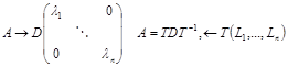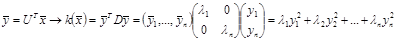 Диагональным, или каноническим видом квадратичной формы называют её вид в случае, если матрица коэффициентов является диагональной: Для выполнения преобразования необходимо установить связь между исходными и новыми переменными Линейное преобразование одной группы переменных: Если С не вырождена, то есть её определитель не равен нулю, существует обратная к ней матрица, такая, что: Для приведения квадратичной формы к каноническому виду необходимо произвести такие преобразования, что бы матрица квадратичной формы стала диагональной. Условия приведения квадратной матрицы к диагональному виду: Если квадратная матрицы порядка п имеет несколько линейно независимых собственных векторов и соответствующих собственных значений, то она может быть приведена к диагональному виду, причём элементы диагональной матрицы являются собственные значения. Пример: Понятие об ортогонально матрице: Для того, что бы новая, повёрнутая система координат была прямоугольной необходимо, что бы матрицы линейных преобразований была ортогональной. Матрица линейных преобразований называется ортогональной, если её столбцы являются ортогональными арифметическими векторами. Арифметическим вектором в линейной алгебре называется столбец из нескольких чисел Скалярным произведением двух векторов одной и той же размерности называется сумма по парных произведений соответствующих координат. Нормой вектора называется квадратный корень из его скалярного квадрата. Матрица С называется ортогональной, если её столбцы нормированы. Ортогональная матрица обладает следующим свойством: операцию обращения можно заменить операцией транспонирования. Процедура Шмидта ортогонализации матриц: Любую систему линейно независимых векторов, то есть базис п -мерного пространства, можно преобразовать в ортогональную систему векторов с помощью следующей рекуррентной процедуры: Любая арифметическая система координат может быть преобразована в прямоугольную систему координат: Доказательство: