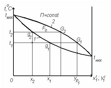 Полученный интервал температур кипения компонентов делится на несколько малых (t1,t2,t3 и т.д.) и для каждого значения температур по справочнику либо по уравнению Антуана (уравнение 6.22) определяются давления насыщенного пара компонентов P1 и P 2. Затем по уравнению изотермы жидкой фазы (уравнение 6.35) определяют состав жидкой фазы (х1,х2 и т.д.), соответствующий определенной температуре, а по уравнению (6.31) – состав паровой фазы ( Точки, лежащие на линии кипения (g1;g2 и т.д.) соответствуют жидкой фазе, находящейся при температуре кипения. Любая точка, находящаяся ниже этой кривой, характеризует недогретую до температуры кипения жидкую фазу. Аналогично, любая точка, лежащая выше кривой конденсации (линия 2), характеризует систему, состоящую из паровой фазы (перегретый пар). Точки, находящиеся между кривыми кипения и конденсации (например, точка F Изотермы g1G1; g2G2 и т.д., характеризующие состав равновесных жидкой и паровой фаз, называются нодами или конодами.