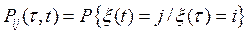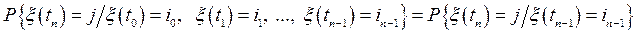 Это определение является непрерывным аналогом определения (66). Интерпретация та же самая: состояние системы S в будущем зависит только от текущего ее состояния (настоящего) и не зависит от того, как и когда система попала в это состояние. Определение. Цепи Маркова, сформулированные в терминах случайных процессов, называются марковскими процессами. Рассмотренные здесь цепи Маркова - суть марковские процессы. Непрерывные марковские процессы отличаются от дискретных тем, что случайные изменения состояний системы зависят от непрерывно изменяющихся параметров. Пусть задан процесс x(t), определяющий состяние ситемы в момент времени tÎT. Зададим процесс ее развития: если, в данный момент времени t (t< t), система находится в состоянии i, то в последующий момент времени t она будет находится в состоянии j с вероятностью
