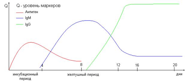 Иммуноглобулины определяются в течении 3 – 6 месяцев. IgG определяется в желтушный период и длительное время после него (маркер перенесенного вирусного гепатита А). Прогноз благоприятный. Хронизации процесса не наблюдается. Лечение. Витамины, режим, диета (составляют базовую терапию). Противовирусные средства не назначаются. Профилактика. Вводится инактивированная культуральная вакцина, а так же γ-глобулин. Накладывается карантин.