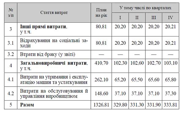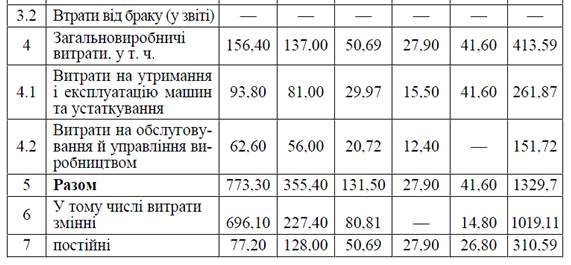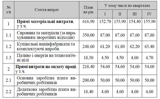Є сенс коротко з’ясувати зміст статей кошторису, представленого в табл. 1. Сировина та матеріали (за вирахуванням зворотніх відходів). У цю статтю входять витрати на матеріали, що утворюють матеріально-речову основу продукції, що виготовляється, а також на матеріали допоміжного призначення, які припускають пряме віднесення на окремі вироби (з’єднуючі деталі, фарби, лаки, формовочні матеріали тощо). Розглядувані витрати обчислюються на підставі норм витрачання та цін матеріалів, а також виробничо програми. В цінах на матеріали, окрім цін придбання, враховуються транспортно-заготівельні витрати (плата за транспорт, вантажно-розвантажувальні роботи, комісійні заготівельним організаціям та ін.). Із вартості матеріалів виключаються зворотні відходи, що являють собою відходи матеріалів, які утворилися в процесі виробництва, але ще можуть бути використані як власне матеріали, або паливо, або якимось іншим чином (продаж на сторону). Купівельні напівфабрикати та комплектуючі вироби. Купівельними напівфабрикатами вважаються вироби, які підлягають додатковій обробці на підприємстві (штамповки, відливки, поковки та ін.). До комплектуючих належать вироби, які купуються для укомплектування продукції, що виготовляється, і потребують витрат на їх установку чи складання (вузли агрегатів, двигуни, прилади, механізми тощо). Як і витрати на матеріали, витрати за даною позицією обчислюються відповідно до норм і цін з урахуванням транспортно-заготівельних витрат. Паливо і енергія на технологічні цілі. Ця стаття містить витрати на всі види палива і енергії, пов’язані з безпосереднім здійсненням технологічних процесів: плавлення, нагрівання, зварювання, сушіння і т.п. Вихідними параметрами для обчислення витрат на паливо і енергію технологічного призначення аналогічно попереднім статтям є норми витрат і ціни (тарифи). Основна заробітна плата виробничих робітників. До статті входить оплата праці робітників, безпосередньо задіяних у виготовленні основної продукції. Структурно її складає відрядна та погодинна заробітна плата, які розраховуються згідно з нормами витрат часу на виконання технологічних операцій, відрядними розцінками і тарифними ставками. Сюди відносять і доплати вказаним робітникам з фонду заробітної плати в процентах від прямого заробітку. Додаткова заробітна плата виробничих робітників. У статтю включають виплати за трудові успіхи (премії), оплату відпусток, часу виконання державних та громадських обов’язків, доплати за виконання додаткових функцій та ін. Величина цих виплат розраховується згідно з передбаченими умовами оплати праці в плановому періоді, а за умови їх відносної стабільності - у відсотках від основної заробітної плати. Відрахування на соціальні заходи. До них належать відрахування в Пенсійний фонд і фонди соціального страхування та сприяння зайнятості. Вони обчислюються у встановлених процентах від суми основної та додаткової зарплати. Втрати від браку (у звіті). Ця стаття складається з витрат за остаточно забракованою продукцією (виробами, напівфабрикатами), а також витрат на виправлення браку за вирахуванням: вартості остаточно забракованої продукції; суми, що відшкодовується працівниками, які допустили брак; суми, одержаної від постачальників за неякісні матеріали і комплектуючі вироби тощ