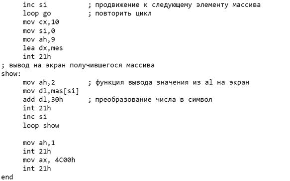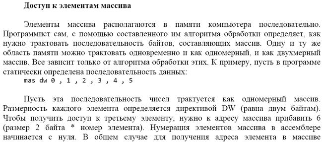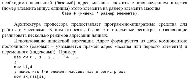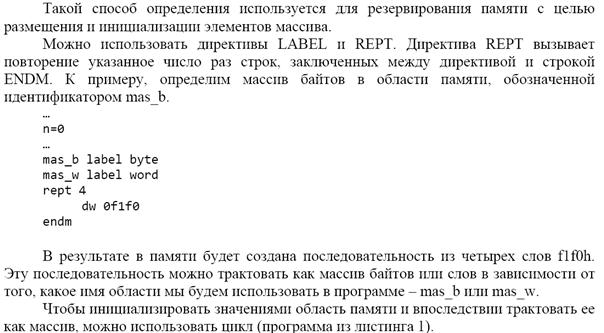 Применение масштабирования облегчает работу с массивами, которые имеют размер элементов, равный 2, 4 или 8 байт, так как микропроцессор сам производит коррекцию индекса для получения адреса очередного элемента массива. Нам нужно лишь загрузить в индексный регистр значение требуемого индекса (считая от 0). Кстати сказать, возможность масштабирования появилась в микропроцессорах Intel, начиная с модели i486. По этой причине в рассматриваемом здесь примере программы стоит директива .486. Ее назначение, как и ранее использовавшейся директивы .386, в том, чтобы указать ассемблеру при формировании машинных команд на необходимость учета и использования дополнительных возможностей системы команд новых моделей микропроцессоров.