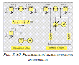 Розімкнене і замкнене коло живлення. Гідравлічний двигун встановлюється у розімкнене або замкнене коло живлення (рис. 8.30 ). У розімкненому колі помпа нагнітає в одному напрямі. Напрям обертання двигуна змінюється розподільником. Гідравлічна рідина повертається назад до резервуару і там охолоджується. Частинки спрацьованих деталей, а також різні забруднення відфільтровуються в резервуарі. У замкненому колі зміна напряму обертання двигуна здійснюється завдяки помпі зі змінною подачею, яка може нагнітати рідину в двох напрямах. У цьому випадку розподільник не потрібний, тому що зміна режиму відбувається дуже швидко. Однак гідравлічна рідина нагрівається значно більше, ніж у розімкненому колі живлення, і тому її частіше потрібно замінювати, враховуючи швидше старіння. Втрати рідини, які викликані просочуванням, компенсуються засмоктуванням оливи з резервуару через трубопроводи з двома зворотними клапанами.