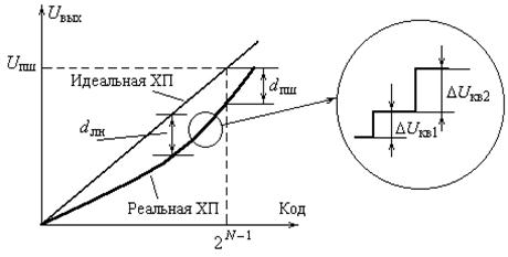 где U пш – напряжение полной шкалы, соответствующее максимальному выходному напряжению, 2 N – 1 – количество ступеней квантования. Абсолютная погрешность преобразования d пш показывает максимальное отклонение выходного напряжения в конечной точке реальной характеристики преобразования от выходного напряжения в конечной точке идеальной характеристики преобразования (рис. 11.4).