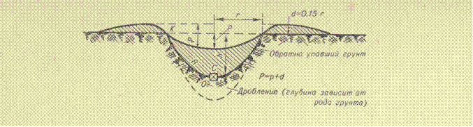 r – радиус воронки, d – высота гребня воронки, p – видимая глубина воронки, P – общая глубина воронки, считая высоту гребня (валика), R – радиус разрушения, C –масса заряда, h – глубина заложения заряда (или линия наименьшего сопротивления – ЛНС).