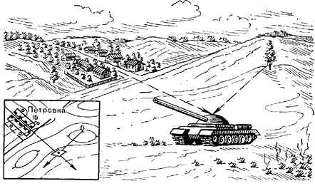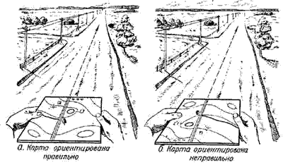 Определение своего местоположения по ближайшим ориентирам на глаз. Это наиболее распространенный способ. На ориентированной карте опознают один-два местных предмета, видимых на местности, затем определяют глазомерно свое местоположение относительно этих предметов по направлениям и расстояниям до них и намечают точку своего стояния (рис.1).