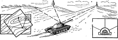 Рис.1 Определение точки стояния по ближайшим ориентирам. Если точка стояния на местности находится рядом с каким-либо местным предметом или его характерным изгибом (поворотом), изображенным на карте, то место расположения условного знака (точки поворота) этого предмета будет совпадать с искомой точкой стояния. По направлению на ориентир и расстоянию до него точка стояния может быть определена, если на местности и на карте опознан только один ориентир. В этом случае на ориентированной карте к условному знаку опознанного ориентира прикладывают линейку, визируют ее на ориентир на местности, по краю линейки прочерчивают прямую линию и откладывают на ней расстояние от ориентира. Полученная на линии визирования точка и будет искомой точкой стояния. Промером расстояния. Этот способ чаще всего применяется при движении по линейному ориентиру или вдоль него (по дороге, просеке и т. д.), а также при движении по азимуту. На исходном пункте записывают отсчет по спидометру и начинают движение. При определении своего местоположения следует на карте отложить расстояние, пройденное от исходного пункта до точки остановки. Если движение совершается в пешем порядке или на лыжах, пройденное расстояние измеряется шагами или определяется по времени движения. По створу. Створом называется прямая линия, проходящая через точку стояния и две другие характерные точки местности (ориентиры). Если машина находится на линии створа, ее местоположение на карте может быть определено одним из следующих способов: