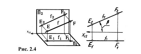 Ее фронтальная проекция f2 и угол наклона ее к плоскости П1 (угол β) проецируются на плоскость П2 без искажения.