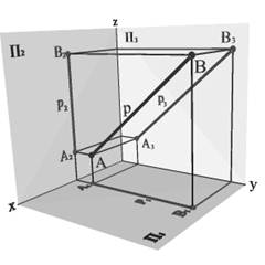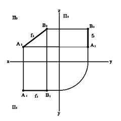 Рис. 2.5 Графическим признаком профильной прямой на комплексном чертеже является ее горизонтальная и фронтальная проекции перпендикулярные координатной оси x12. Ее профильная проекция и углы наклона ее соответственно к плоскостям П1 и П2 проецируются на плоскость П3 без искажения. Положение горизонтали h и фронтали f в пространстве определяется заданием на чертеже двух их проекций h1 и h2, f1 и f2. Две проекции р1 и р2 профильной прямой р не определяют ее положение в пространстве, так как этим проекциям могут соответствоватьт множество прямых, параллельных профильной плоскости. По аналогии с этим горизонталь не определяется двумя своими проекциями h2, h3, а фронталь - f1 и f3. Поэтому для определения прямой р необходимо задать две проекции р2, р3 или р1, р3 или же задать на прямой р две точки А и В (рис. 2.2.10) - р2(А2В2) и р1(А1В1). Следовательно, двухпроекционный комплексный чертеж линии уровня обратим только в том случае, если он содержит проекцию прямой на параллельную ей плоскость проекций.