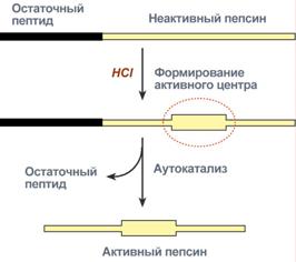 Пепсин является эндопептидазой, то есть он расщепляет внутренние пептидные связи в молекулах белков и пептидов. Синтезируется в главных клетках желудка в виде неактивного профермента пепсиногена, в котором активный центр "прикрыт" N-концевым фрагментом. При наличии соляной кислоты конформация пепсиногена изменяется таким образом, что "раскрывается" активный центр фермента, который отщепляет остаточный пептид (N-концевой фрагмент), т.е. происходит аутокатализ. В результате образуется активный пепсин, активирующий и другие молекулы пепсиногена.
