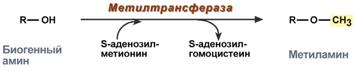 Метилирование биогенного амина происходит при наличии у него гидроксильной группы (дофамин, серотонин). В реакции принимает участие активная форма метионина – S-аденозилметионин (SAM), образуется метилированная форма амина и S-аденозилгомоцистеин (SАГ).