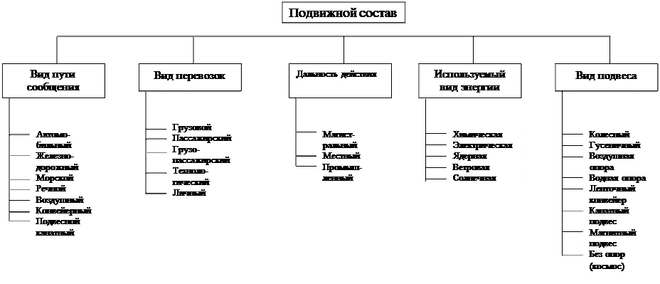 Перемещение грузов и пассажиров осуществляется подвижным составом. В зависимости от вида пути сообщения, вида перевозок, дальности действия, используемой энергии, вида поддерживающего подвеса подвижной состав характеризуется большим разнообразием (рис. 2). Некоторые виды транспорта обходятся без подвижного состава. Это в первую очередь трубопроводный транспорт. Груз перемещается по трубопроводу под действием разности давления. Конвейер, перемещая груз, сам остается на месте, а движется только конвейерная лента. Аналогичная ситуация с подвесными канатными дорогами. Линии электропередач также обходятся без подвижного состава. Проблемы подвижного состава связаны в первую очередь с значительным износом парка подвижного состава. По разным видам транспорта он колеблется от 45 до 60 %. Средний возраст судов под немецким флагом составляет 7,8 года, тогда как у российских – 20 лет; только 20 % подвижного состава автомобильного транспорта в России имеют возраст до 5 лет, 20 % – от 5 до 10 лет, остальные (60 %) – старше 10 лет, средний возраст легкового автомобиля – 12 лет. Старый подвижной состав имеет эксплуатационные расходы на 25–30 % выше, соответственно выше себестоимость перевозок, ниже гарантии безопасности и показатели качества обслуживания.