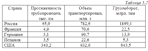 Если, кроме того, посмотреть качество дорожного покрытия, то можно увидеть, что 15% дорог – грунтовые, т.е. пригодны для движения только в сухое или холодное время года, а весной и осенью они непроезжие; 38% дорог имеют недолговечное щебеночное или гравийное покрытие, себестоимость перевозок по таким дорогам в 3–5 раз выше, чем по дорогам с усовершенствованными капитальными типами покрытий. Дороги с твердым покрытием – цементобетонные и асфальтобетонные составляют 47%. При современной интенсивности движения дороги с твердым покрытием, построенные по советским технологиям, выдерживают 1–2 года, не больше. Несмотря на приоритеты в сторону более экологичных видов транспорта, в странах Европы продолжается развитие и совершенствование системы трансевропейских автомагистралей, которые включаются в систему транспортных коридоров Европы. Внутренний водный транспорт. Внутренние водные пути на территории Российской Федерации соединяют значительные территории в европейской части (единая глубоководная система), через Балтику, Черное и Каспийское моря с зарубежными странами и имеют особенно большое значение для обеспечения транспортно-экономических связей в северных и восточных районах страны. По обеспеченности внутренними водными путями с нашей страной можно сравнивать США. Внутренний водный транспорт США располагает водными путями в 40,8 тыс. км, что по протяженности составляет около 40% от водных путей России. По внутренним водным путям в США перевозят ежегодно 700 млн т различных грузов, что в 7 раз больше, чем в России. Из данного сопоставления можно сделать вывод, что интенсивность использования внутреннего водноготранспорта России в 10–15 раз ниже потенциально возможной. Трубопроводный транспорт. Доля трубопроводного транспорта в транспортной системе России весьма значительна. Трубопроводный транспорт эффективно используется для экспорта нефти и газа, в настоящее время этот процесс интенсифицируется. Трубопроводы в Приморск, по дну Балтики (Нордстрим), через Черное море позволят увеличить экспорт газа. Протяженность трубопроводов и объем транспортировки в других странах приведены в табл. 5.2.
