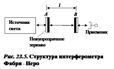 Как показано на рис. 23.5,установив друг против друга полупрозрачные зеркала, можно создать резонатор света с фазовой характеристикой, которая резко изменяется при прохождении света между зеркалами А и В туда и об При изменении фазы, кратном 2 π, наступает резонанс. Тогда при частоте источника света ω диапазон фазового вращения θ = 2 ωl /с, поэтому одну и ту же резонансную характеристику можно получить, изменяя как l, так и ω. Частотный интервал fr называется свободной областью спектра, Δ fr - половинной шириной резонансной кривой: