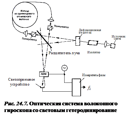 Структура оптической системы гироскопа со световым гетеродинированием представлена на рис. 24.7. Световой луч разделяется с помощью дифракционной решетки на два луча с очень маленьким углом расхождения (около 10 мрад). Эти лучи, пройдя оптическое волокно в противоположных направлениях, подаются на АОМ. Угол дифракции АОМ такой же, как и у дифракционной решетки, вследствие чего АОМ здесь используется не только как частотный сдвигатель, но и как направленный ответвитель, а приемное устройство выдает сигнал разностной частоты. В данной оптической системе возможно разделение световых лучей, двигающихся в противоположных направлениях, но вследствие чрезвычайно малого угла дифракции эти лучи взаимодействуют и дрейф, обусловленный колебаниями среды, ослабляется. Кроме того, обычно при разности длины оптических путей возникает дрейф выходного сигнала вследствие частотного отклонения излучения источника, но в данной структуре эта разность очень мала. К тому же между лучами частотная разность отсутствует, а значит, проблем с частотным смещением здесь тоже нет.